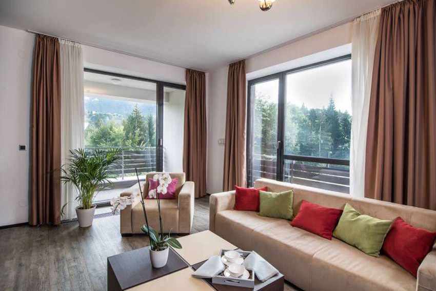 Clădirile rezidențiale oferă o paletă variată de posibilități de cazare, de la garsoniere, la apartamente cu 2 până la 6 camere și tip penthouse. Apartamentele au un living spațios și o vedere superbă asupra muntelui și pădurii.